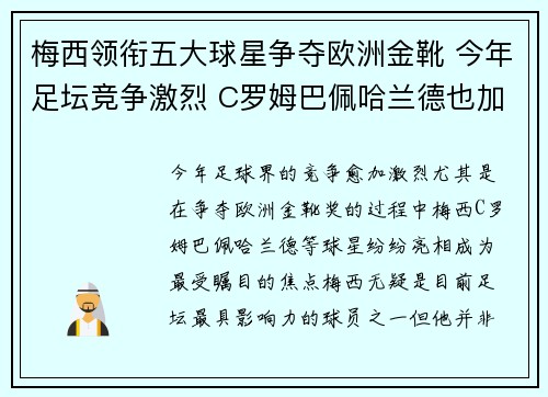 随着世界足坛逐渐步入新的时代,梅西、C罗、姆巴佩和哈兰德等顶级球员的表现仍然令人瞩目。每年金球奖的争夺都成为了全球足球迷的关注焦点,这四位球员的竞争尤其激烈。从梅西的创纪录成就到C罗的无尽动力,再到姆巴佩的爆发性表现与哈兰德的强势崛起,他们都在为足球界最高荣誉——金球奖而奋斗。谁将最终登上世界足坛之...